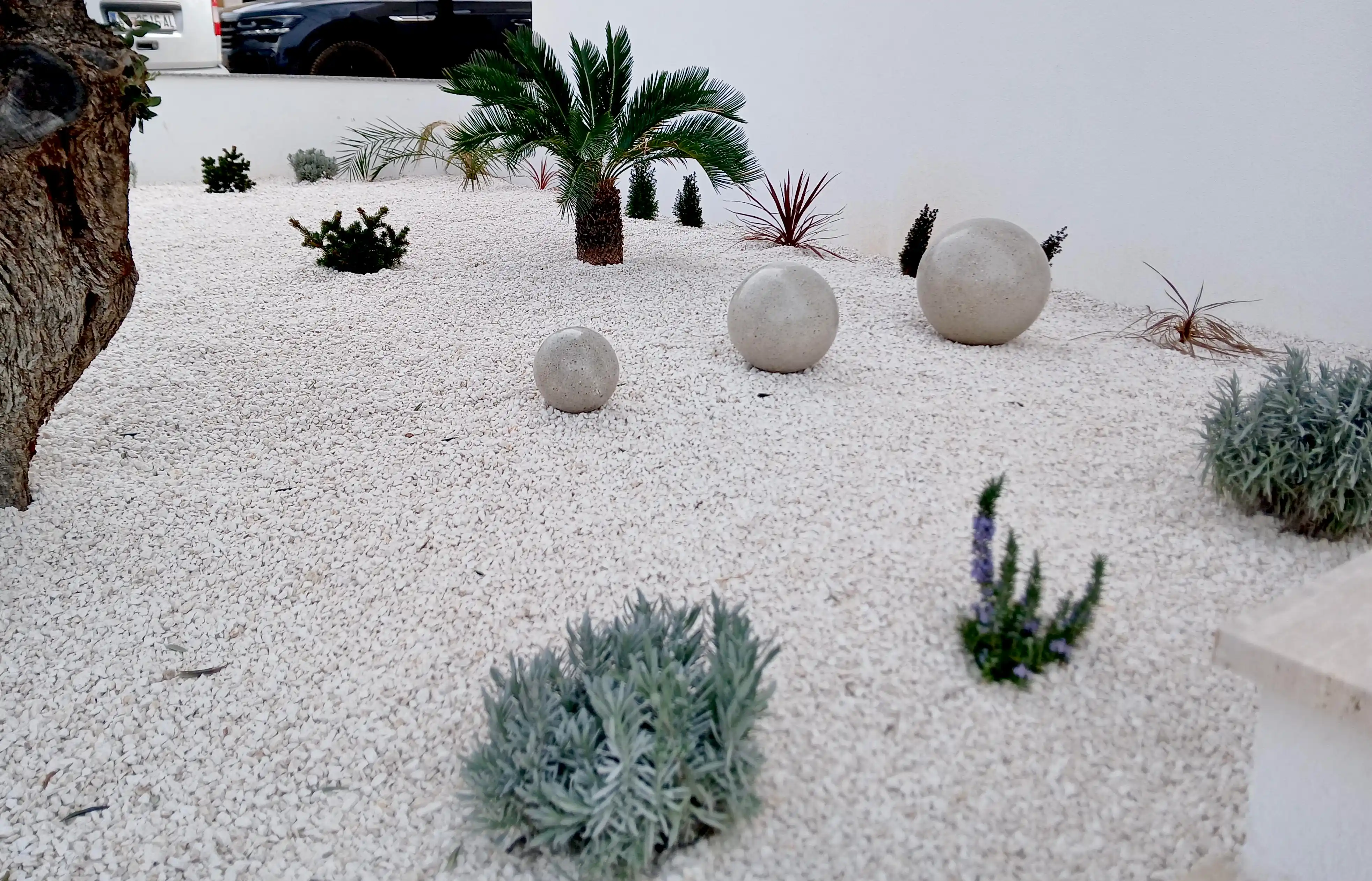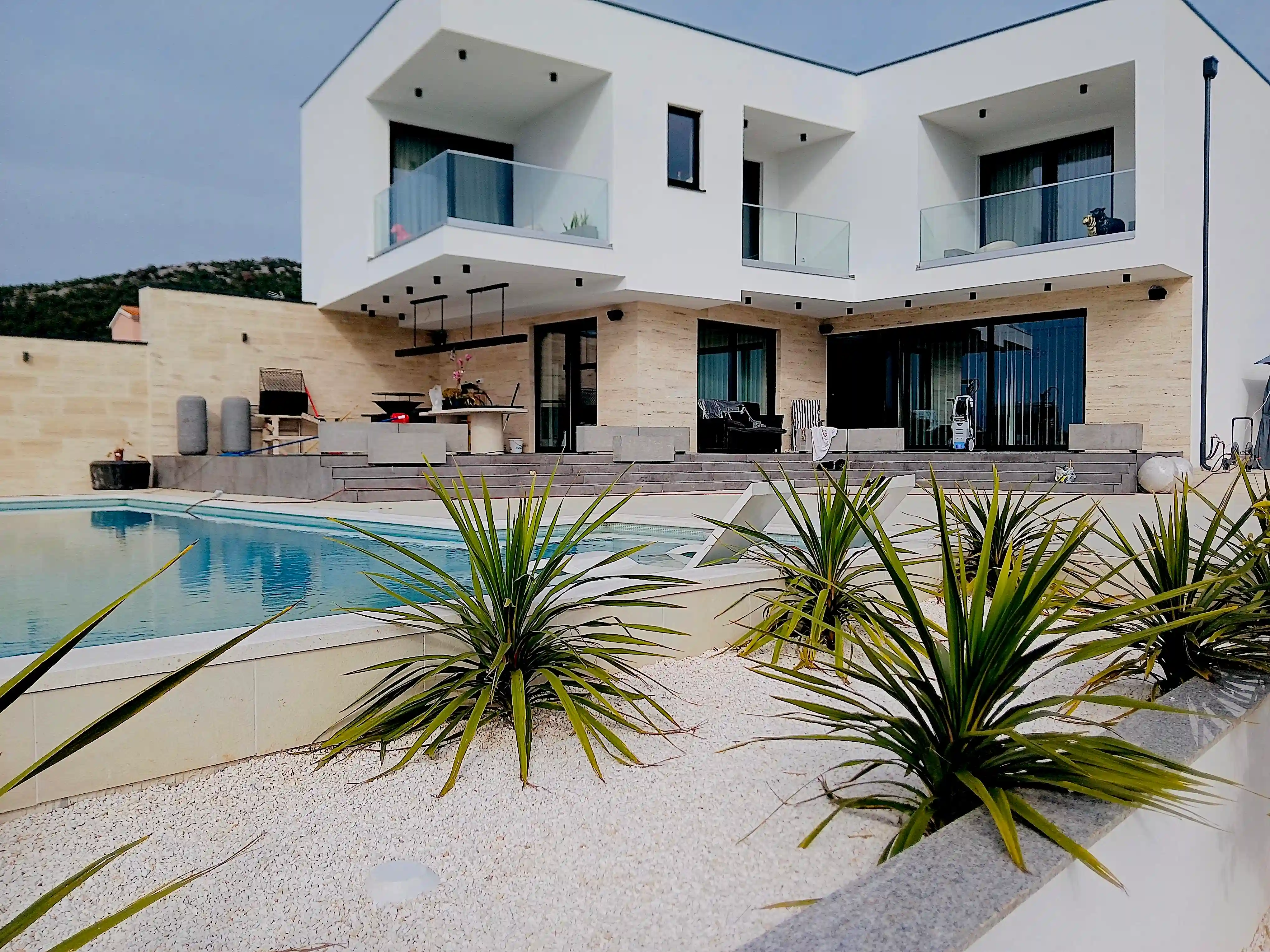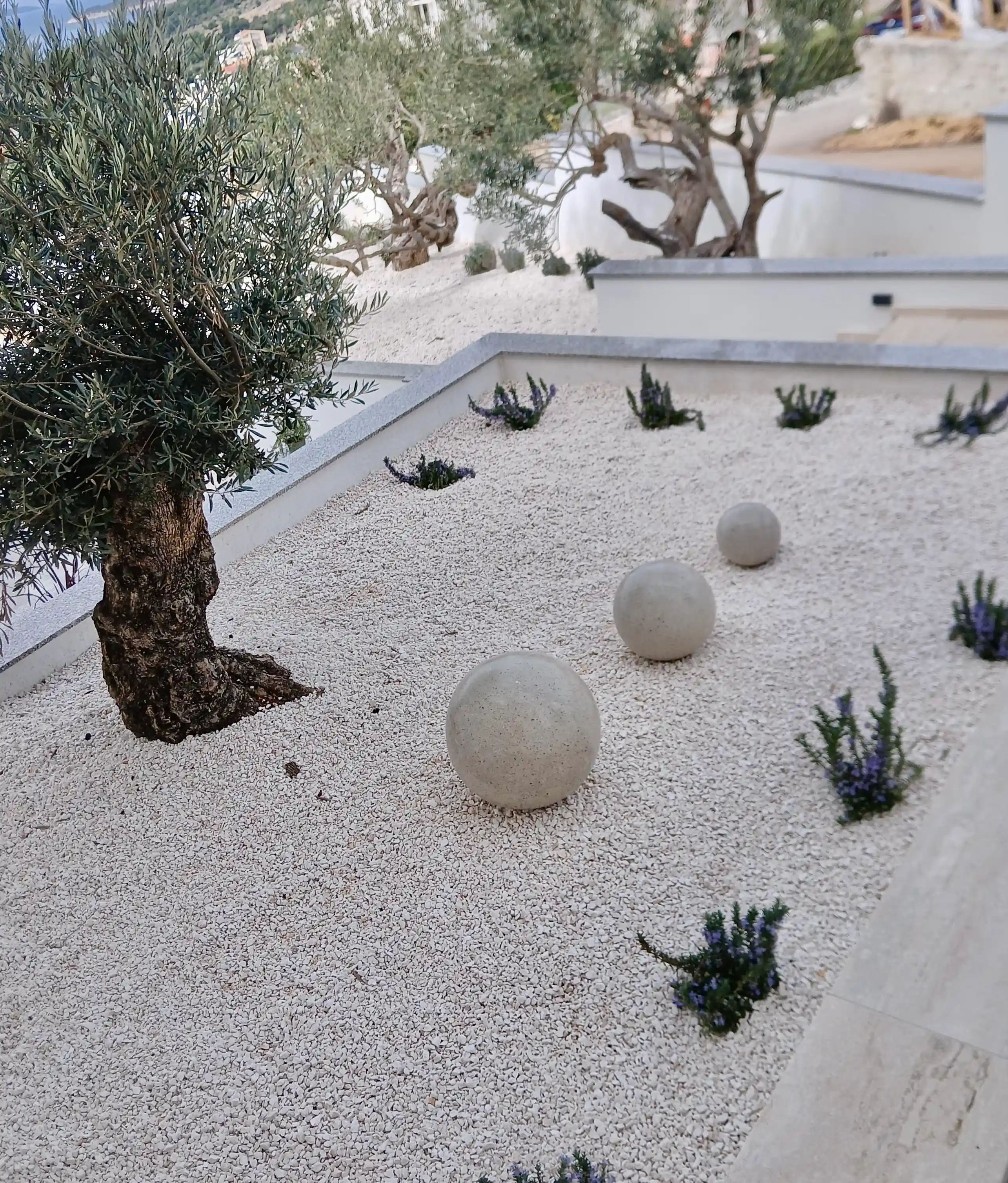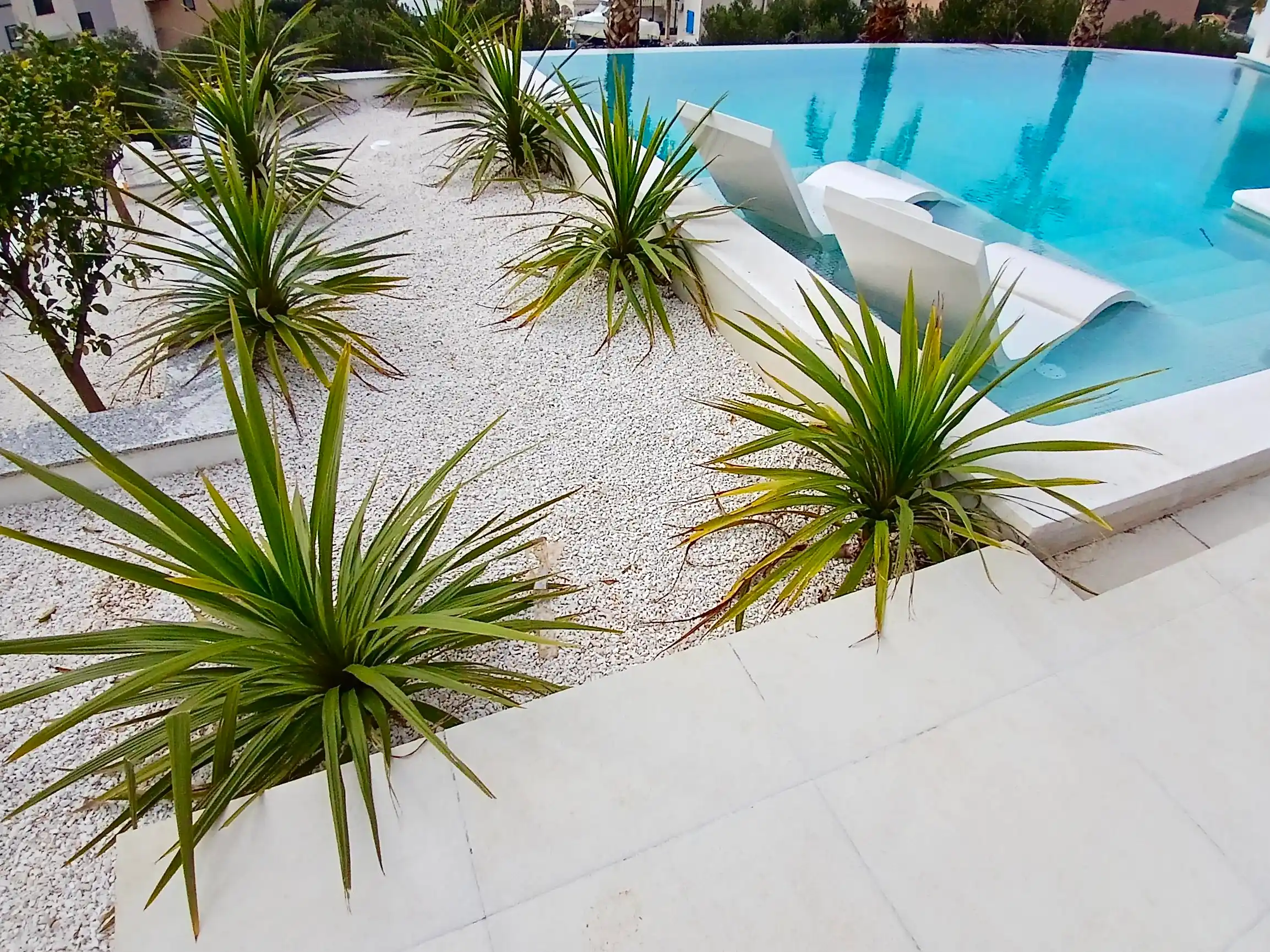 Na atraktivnoj lokaciji u Primoštenu izvedeno je moderno uređenje okućnice koje se savršeno uklopilo u luksuznu arhitekturu vile. Prostor oko bazena obložen je bijelim dekorativnim oblutkom, stvarajući čiste i elegantne linije koje dodatno naglašavaju osjećaj prostranosti i minimalizma. Uz oblutak posađeno je egzotično bilje koje okućnici daje dinamiku i mediteranski karakter, a pažljivim odabirom biljaka postignut je sklad između prirodnih elemenata i suvremenog dizajna.
