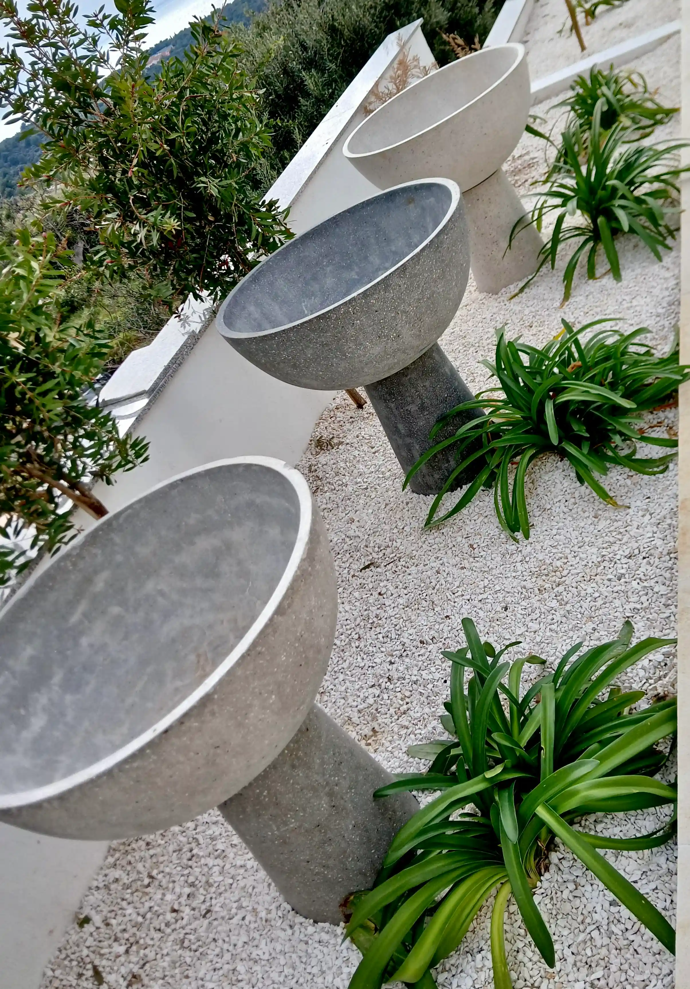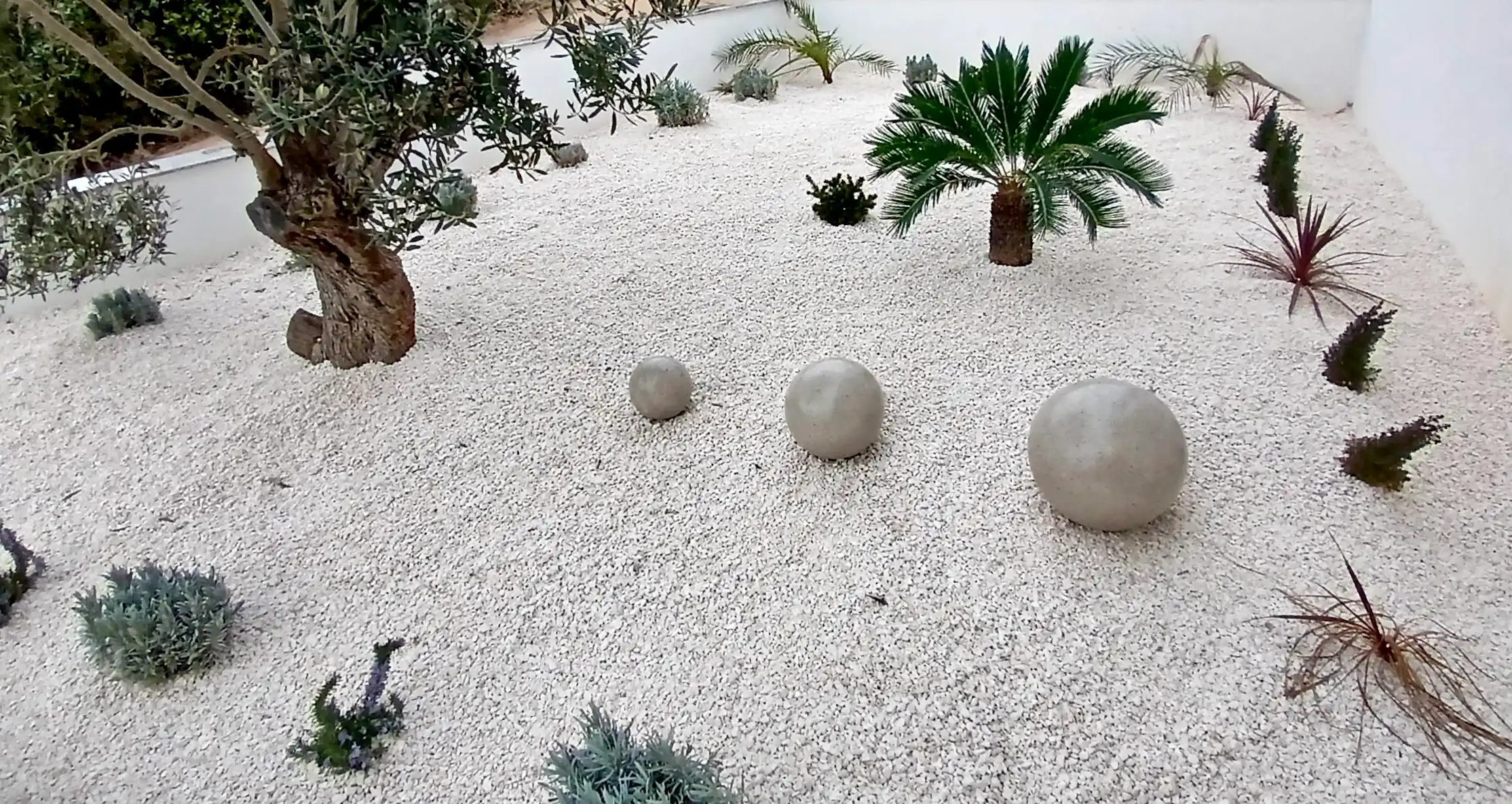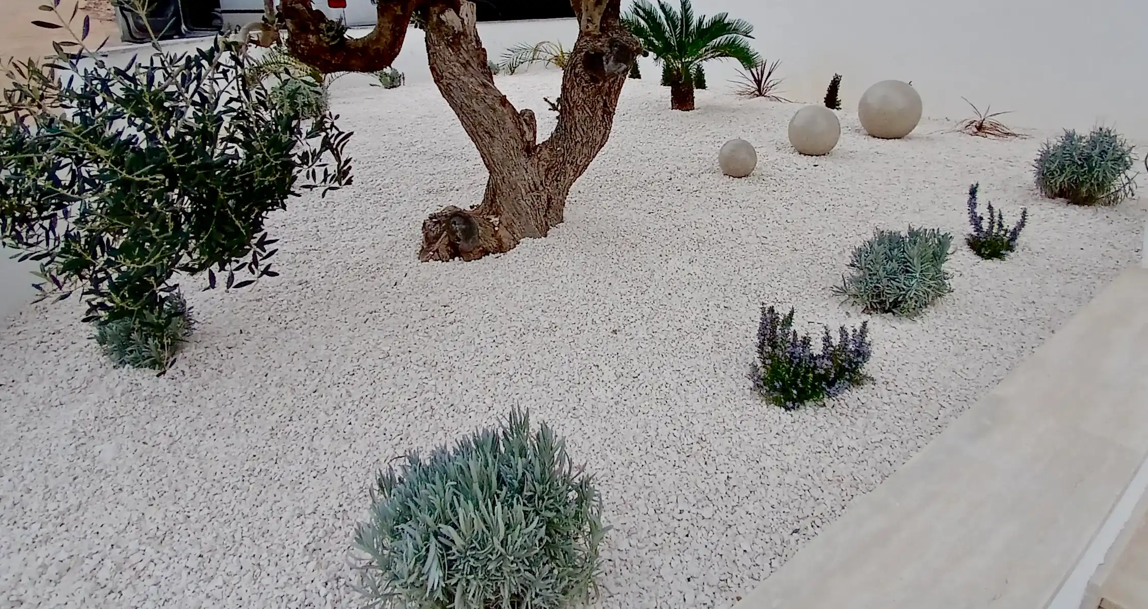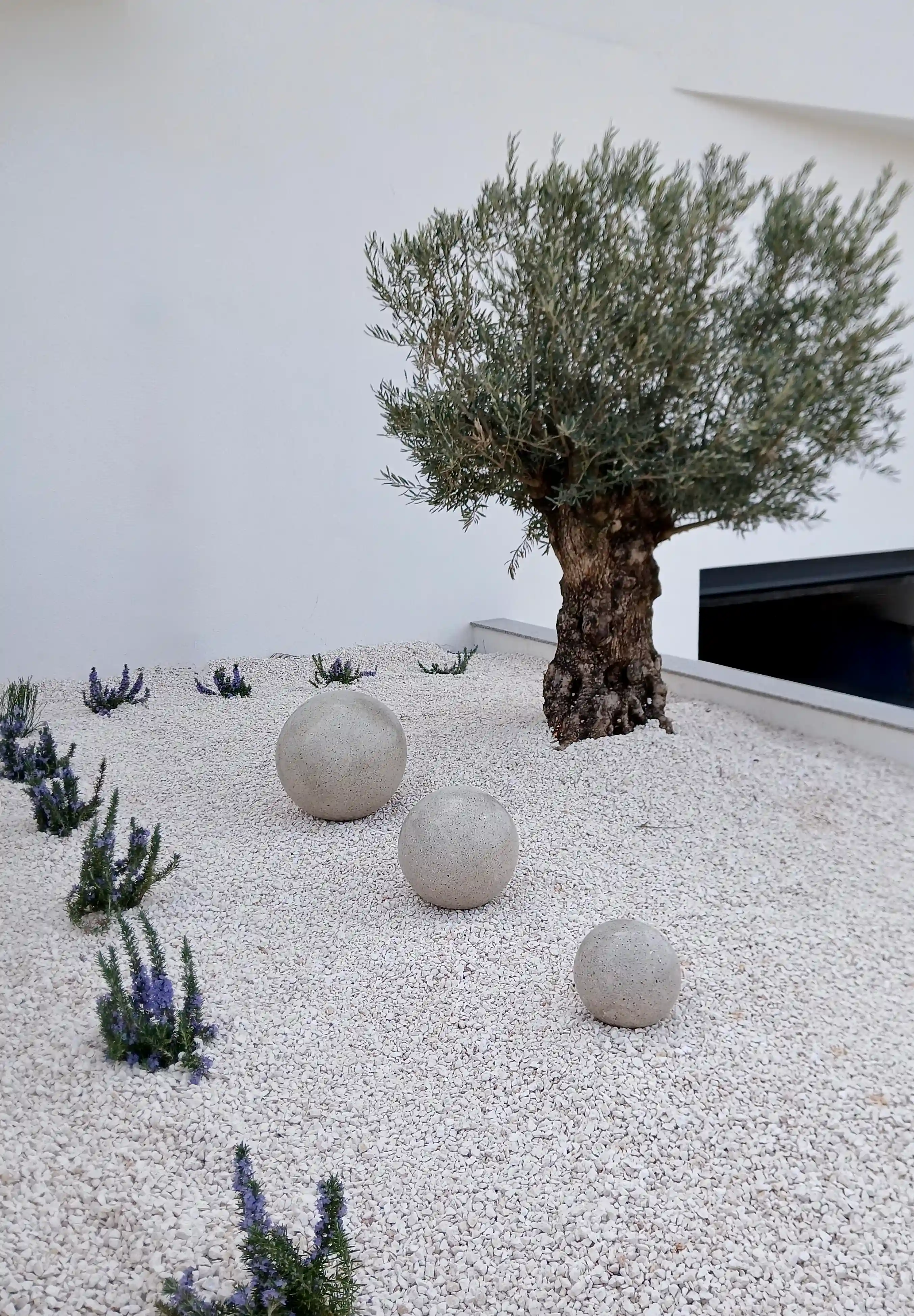 Na atraktivnoj lokaciji u Primoštenu izvedeno je moderno uređenje okućnice koje se savršeno uklopilo u luksuznu arhitekturu vile. Prostor oko bazena obložen je bijelim dekorativnim oblutkom, stvarajući čiste i elegantne linije koje dodatno naglašavaju osjećaj prostranosti i minimalizma. Uz oblutak posađeno je egzotično bilje koje okućnici daje dinamiku i mediteranski karakter, a pažljivim odabirom biljaka postignut je sklad između prirodnih elemenata i suvremenog dizajna.